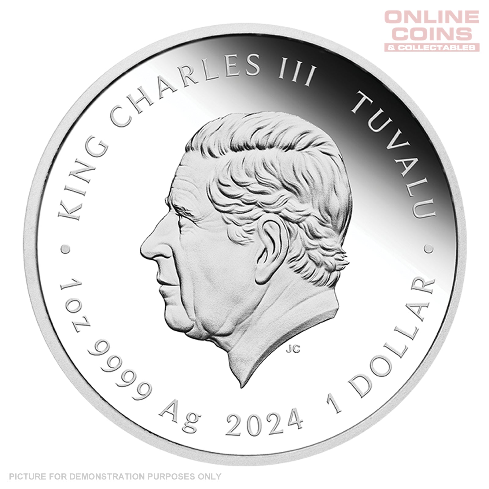 The obverse portrays the Jody Clark effigy of His Majesty King Charles III, as well as the weight, purity, monetary denomination, and 2024 year-date.