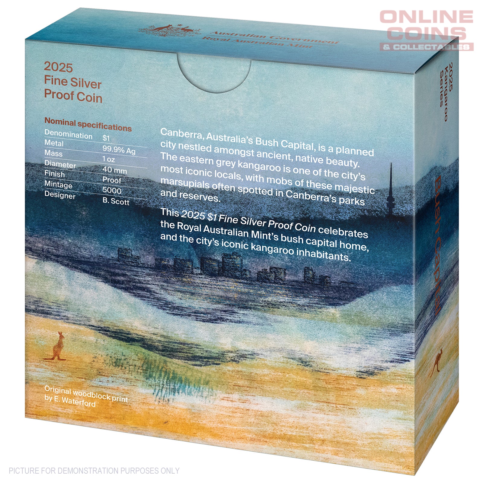 This stunning 2025 $1 Fine Silver Proof Coin celebrates Canberra, the Mint's beautiful bush capital home, and the city's iconic local resident, the eastern grey kangaroo.