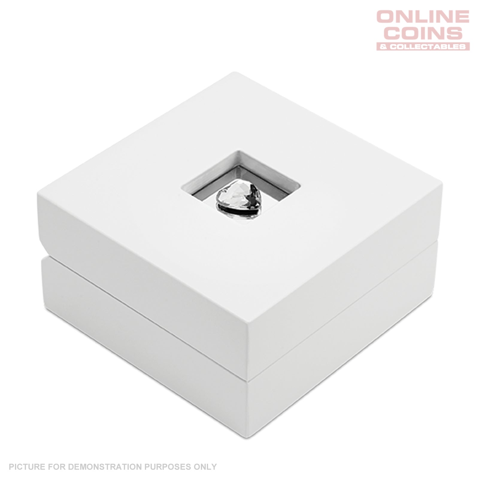 Accompanied by a certificate of authenticity, the coin is presented in a stylish white display box with a heart-shaped crystal set within the lid.