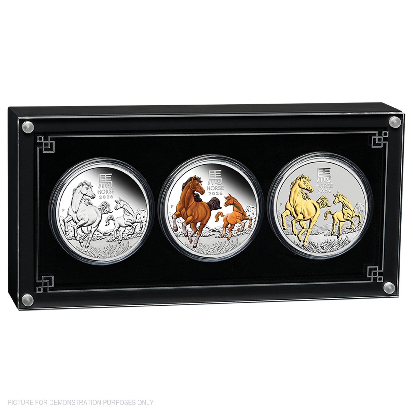 The Perth Mint is proud to present the 2026 Year of the Horse 1oz Silver Trio Set consisting of the Year of the Horse 1oz Silver Proof, 1oz Silver Coloured Proof and 1oz Silver Gilded Coins.
