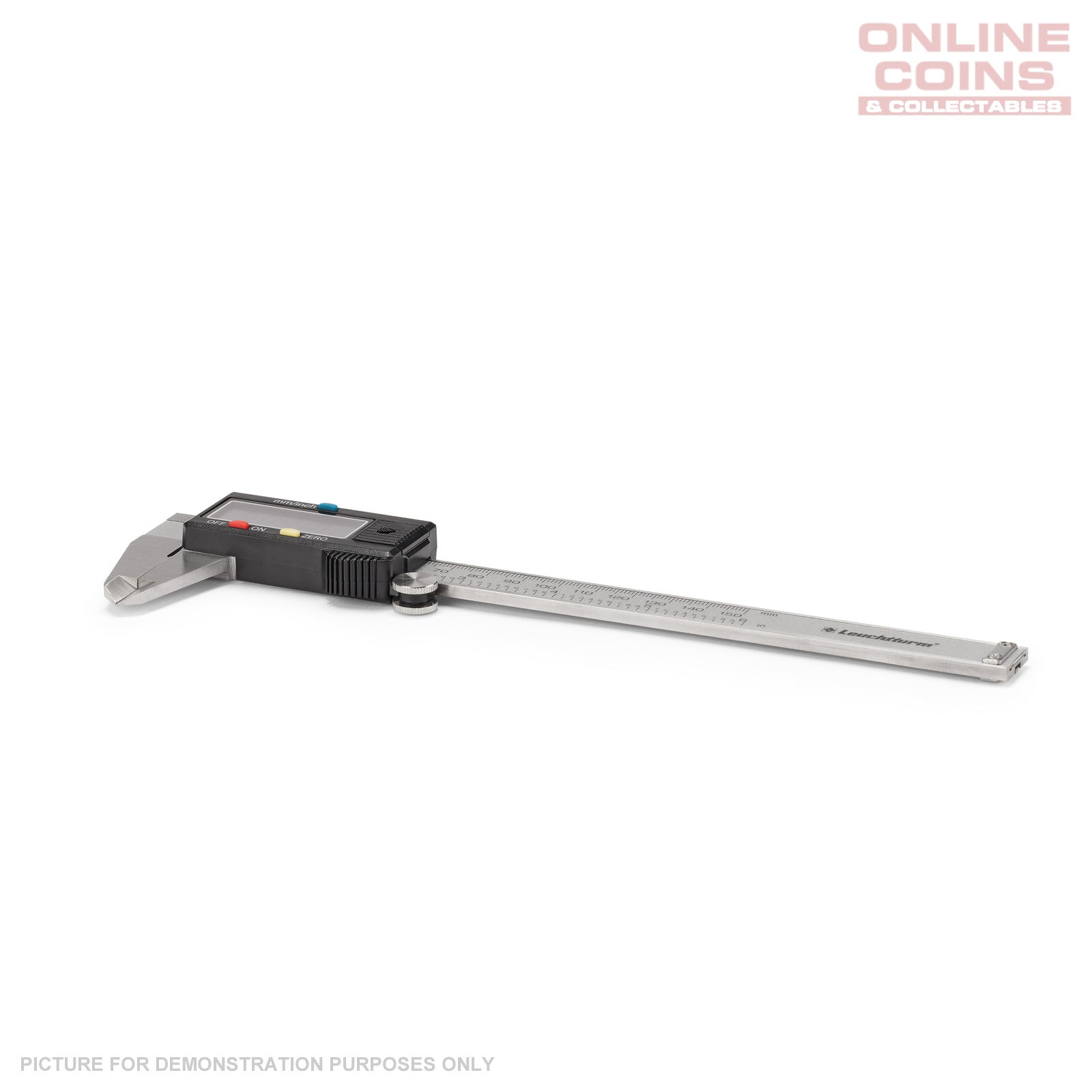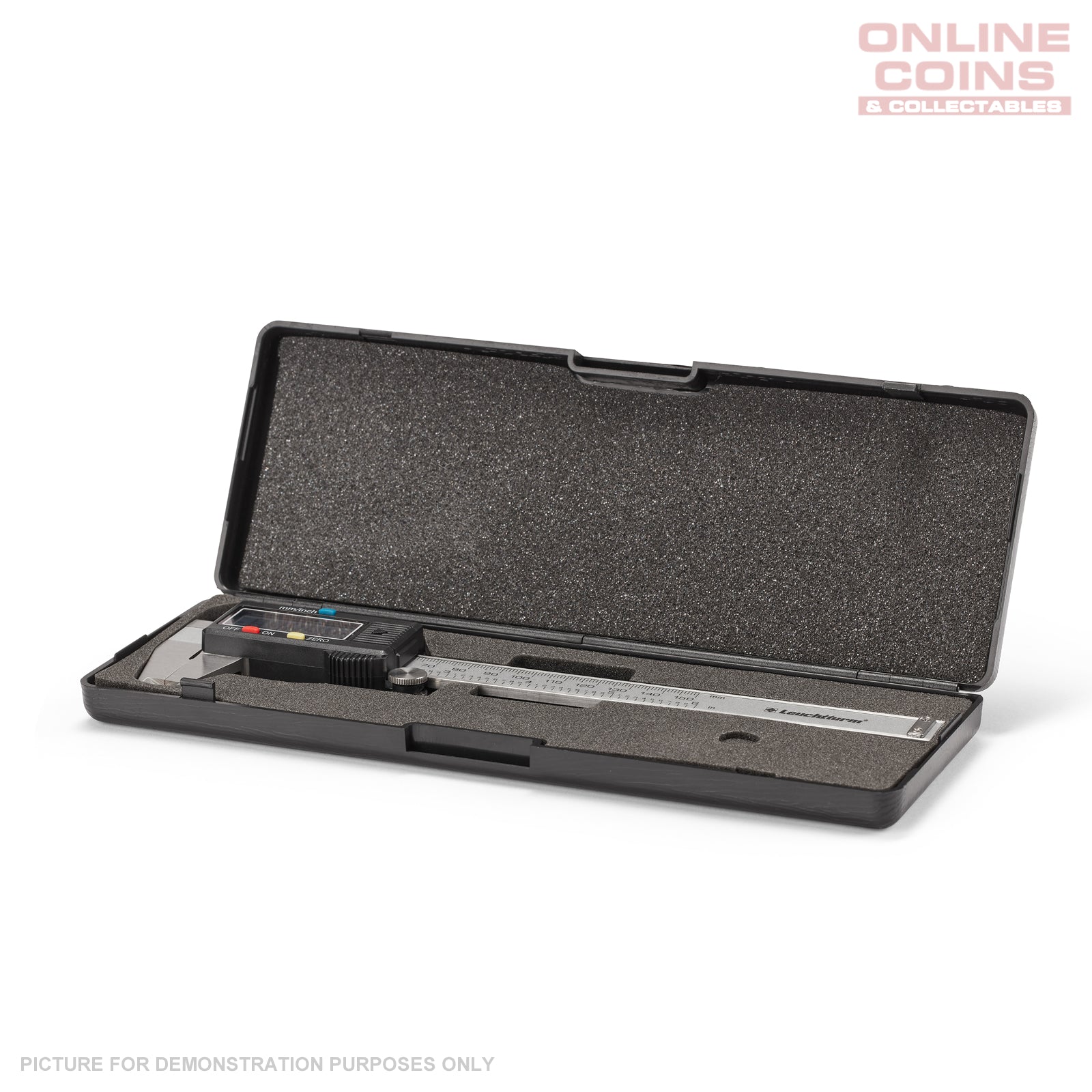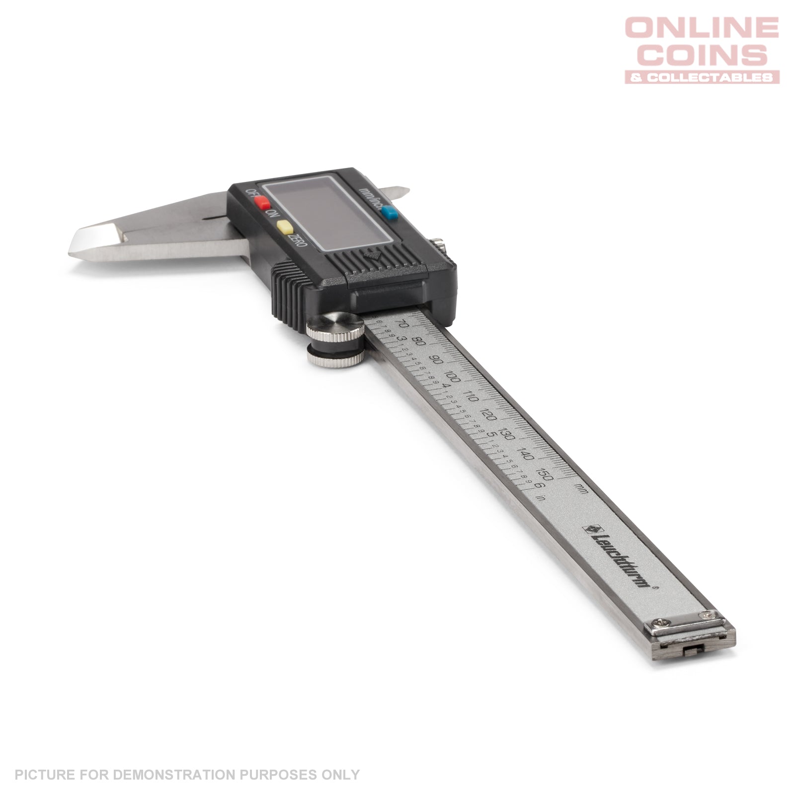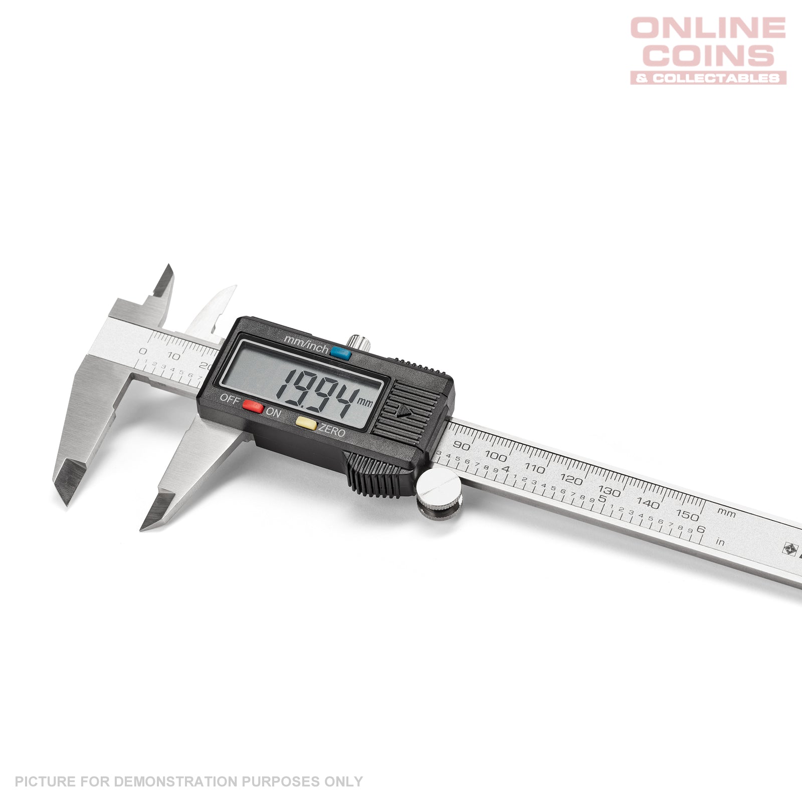 The digital calliper with an LCD display has a measuring range of 0 to 150 mm (6"). It can be zeroed at any time in any measuring position, allowing comparative measurements to be made. With depth gauge to measure inside diameters and grades. Can be switched from metric to imperial. Includes battery. Unit of measurement: 0,01 mm. Accuracy: 0,03 mm.