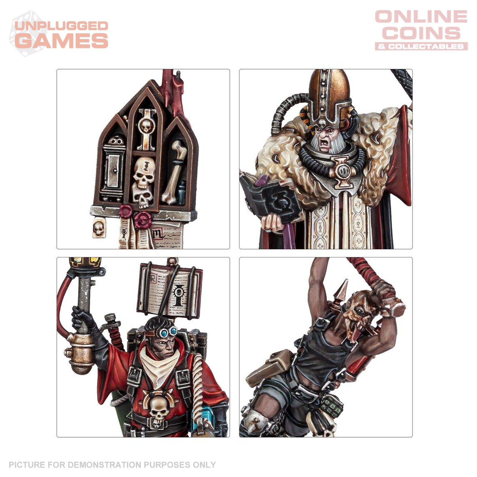 – Sanctifiers Kill Team: A complete kill team of 11 multipart plastic miniatures, consisting of 1x Confessor, 1x Cherub, 1x Death Cult Assassin, 1x Salvationist, 1x Miraculist, 2x Missionaries, 1x Drill Abbot, 1x Persecutor (which can alternatively be built as a Preacher), 1x Conflagrator (which can alternatively be built as a Preacher), and 1x Reliquant (which can alternatively be built as a Preacher).