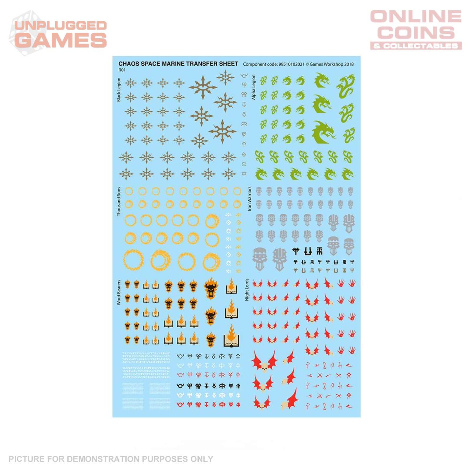 This kit is supplied with 2x Chaos Space Marine Transfer Sheets, each featuring 364 high-quality waterslide transfers. These include icons for the Black Legion, Alpha Legion, Thousand Sons, Iron Warriors, Word Bearers, and Night Lords, along with other cursed sigils for you to decorate your miniatures.