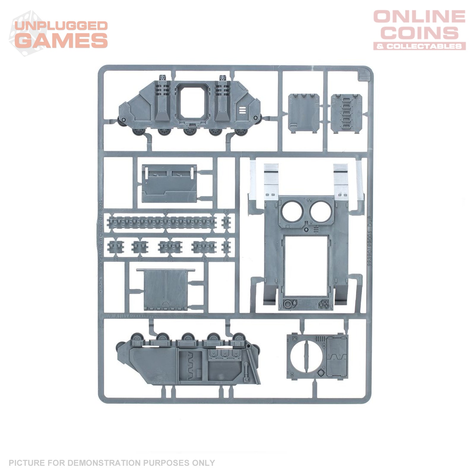 The Chaos Rhino has some cosmetic options, including Chaos icons, trophy racks, chains, hooks, dozer spikes, and corrupted armour plates. It can be armed with a pintle-mounted combi-bolter or combi-weapon, and includes options for a Chaos Space Marine gunner or a closed hatch. It can also sport an optional rooftop havoc launcher for additional long-ranged firepower.