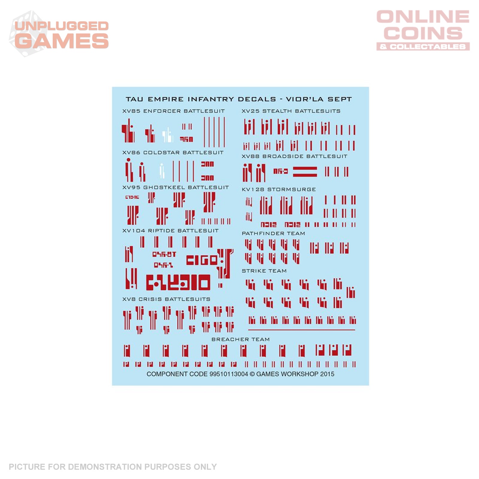 This kit is supplied with 1x T'au Empire Infantry Decals – Vior'la Sept Transfer Sheet, which contains 177 high-quality waterslide transfers to decorate your miniatures. These include a selection of Vior'la Sept markings for various Battlesuits, and for other infantry in your collection, such as Pathfinder Teams, Strike Teams, and Breacher Teams.