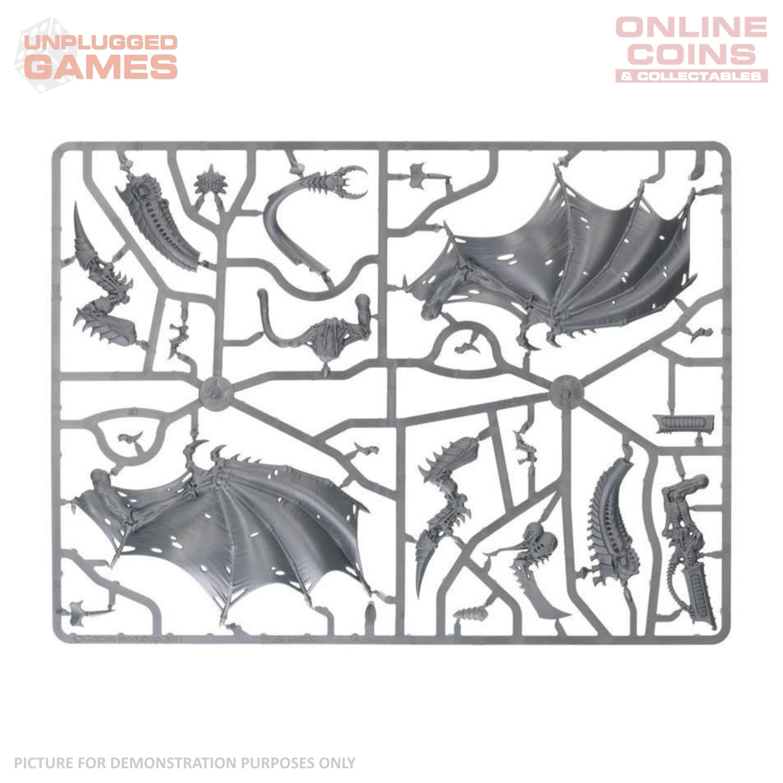 This multipart plastic kit builds one Hive Tyrant, an impressive and incredibly versatile leader-beast that can be built to take on a variety of battlefield roles. This looming creature is a fitting centrepiece for any Tyranid army – it boasts a distinctive chitinous shell studded with chimneys, a snarling head with a cruel horn, and a hideous skeletal underbody. The kit features a huge variety of weapons options, including two scything talons, a heavy venom cannon, a stranglethorn cannon, and a bonesword and a lash whip – as well as biomorphs like adrenal glands and toxin sacs, plus other components for customising your Hive Tyrant. You can also choose to build this kit as flying Winged Hive Tyrant, or the insidious Swarmlord.