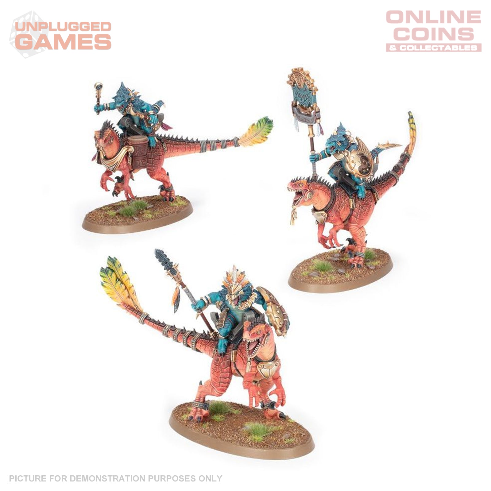 Aggradon Lancers are among the most aggressive cavalry known to the Mortal Realms, for their fearsome scaled steeds only become swifter and more ravenous as battle-frenzy overtakes their senses. A charge of Aggradon Lancers can collapse entire battlelines in a storm of predatory violence, riders and mounts alike lashing out with savage force and overwhelming ferocity.
