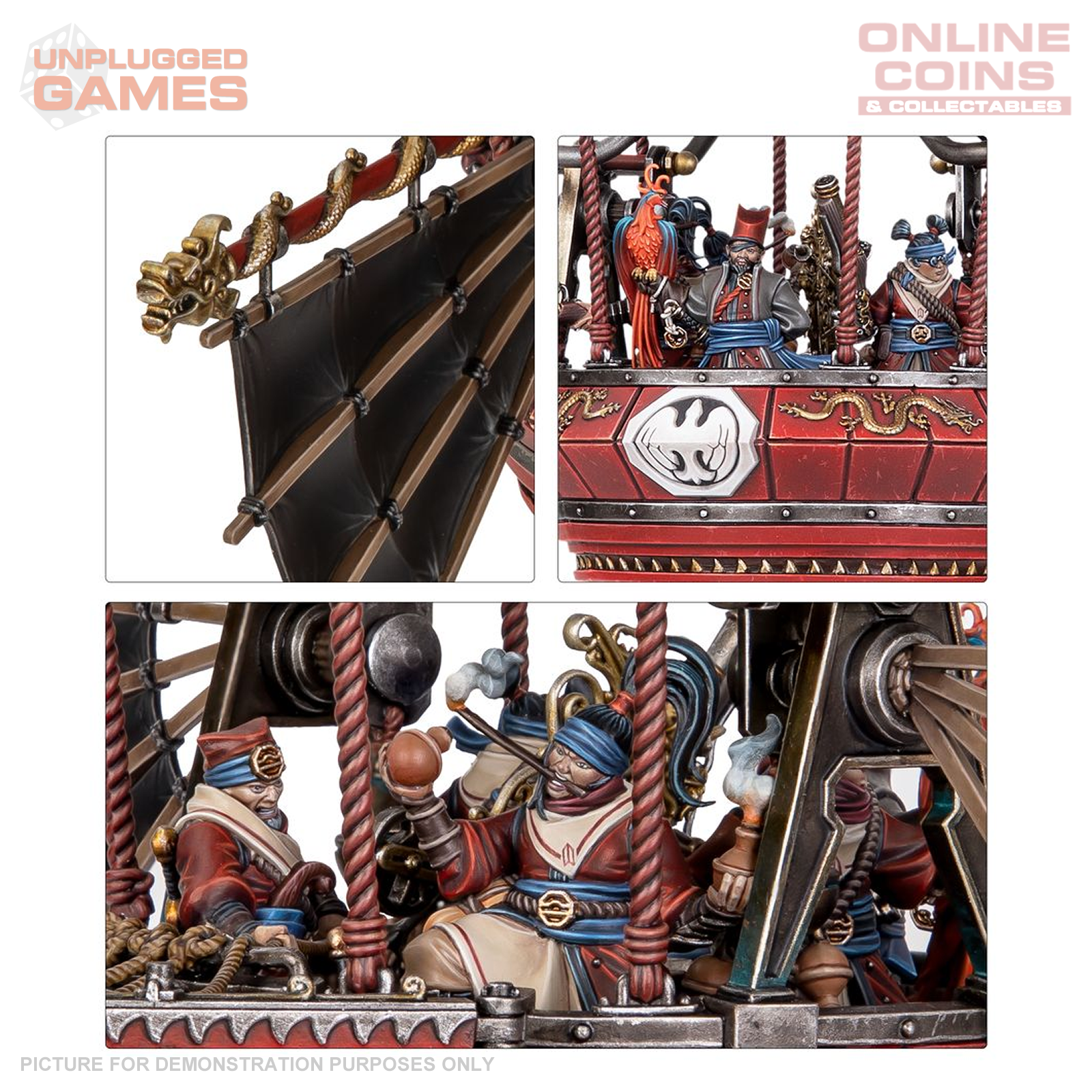 Sky Lanterns are wonders of Cathayan ingenuity used by the Celestial Dragon’s armies to observe enemies from on high and direct troops in battle. Beneath the lantern hangs an armoured gondola, from which one of Grand Cathay’s many Magistrates uses fans and banners to signal troops, or direct the fire of the army’s war machines. Should enemy flyers or missile troops get too close, pairs of Crane Gunners snipe from their exceptional vantage point.