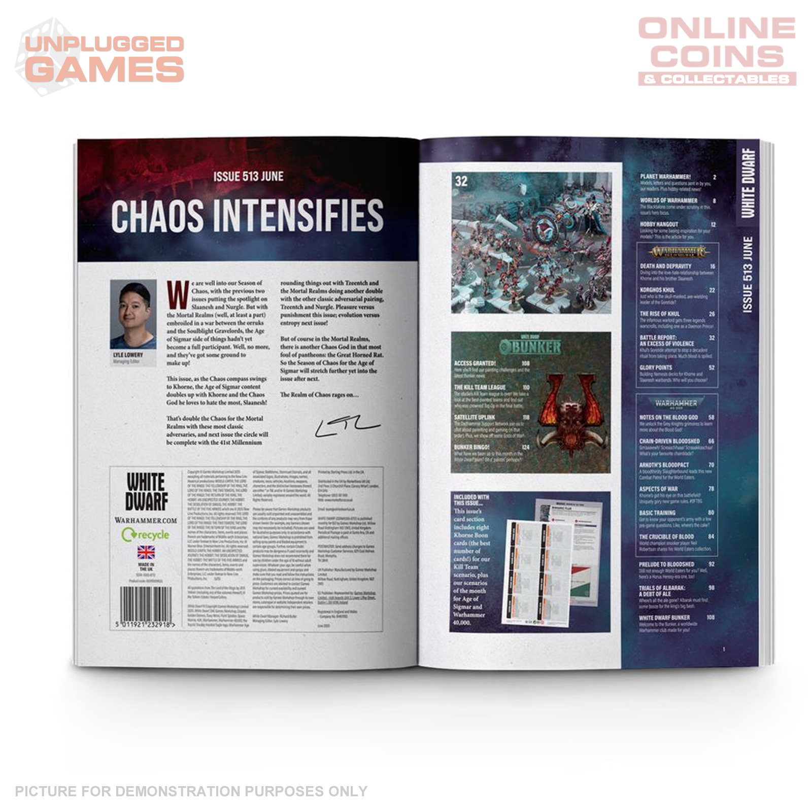 Each copy of White Dwarf 513 also comes with a cardboard insert containing a double-sided card featuring the Warhammer Age of Sigmar and Warhammer 40,000 Scenarios of the Month, and 8x Khorne Boon cards for Kill Team.